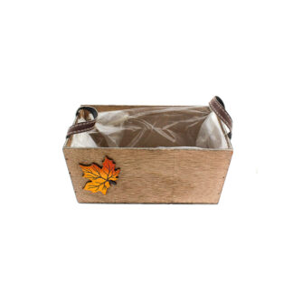 42330Houten planter rechthoek met herfstblad met leren oren bruin 24×18 H10 B21x15cm