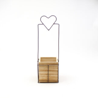 Houten planter naturel vierkant 11x11 H11cm met metalen hengsel met hart 11,5x11,5 H38,5cm