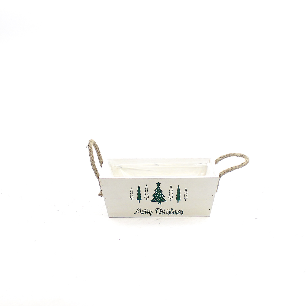 Houten bak wit met groene print kerstbomen met touworen rechthoek 24x14 H9 B21x11cm aantal