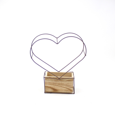 Houten planter naturel rechthoek 15,5×8 H8,5cm met metalen boog hart 31×9 H29/26cm