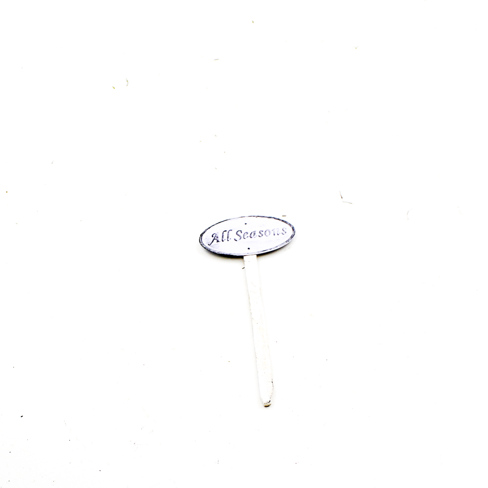 Metalen bordje ovaal wit “All Seasons” op houten steker