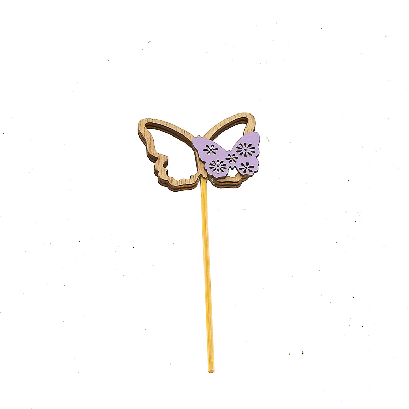 Vlinder hout lila met kleine vlinder erop 6x4,8cm op steker 10cm aantal