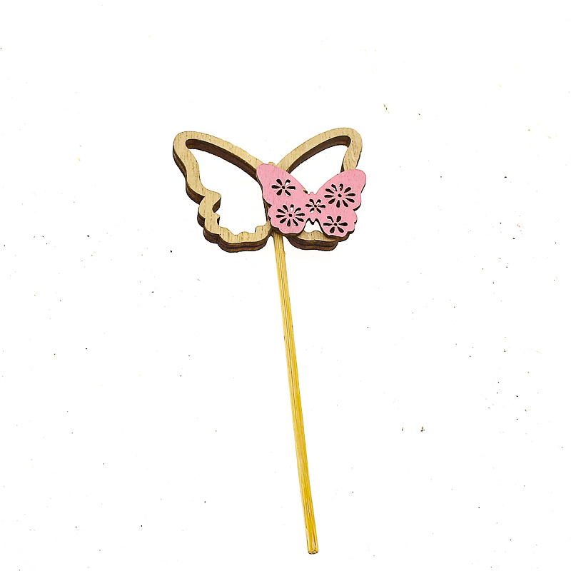 Vlinder hout roze met kleine vlinder erop 6x4,8cm op steker 10cm aantal