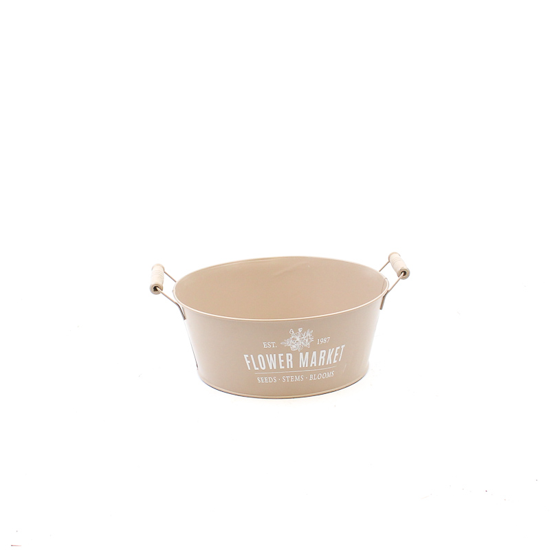 Zink mat taupe "Flower Market" met houten oren ovaal 26,5x16,5 H12 B21,5x11,5cm